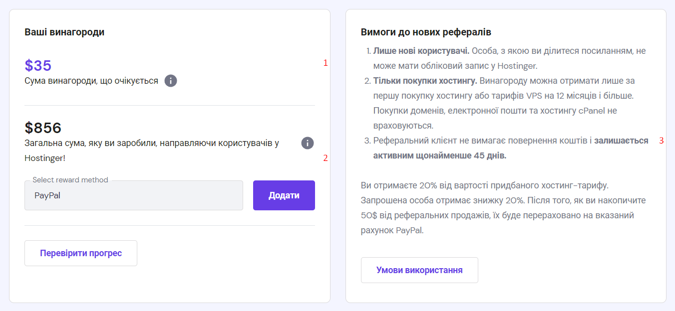 Загальна сума – кошти, які Ви заробили, направляючи користувачів у Hostinger. Натисніть “Перевірити прогрес”, щоб переглянути детальну інформацію про усіх запрошених осіб.