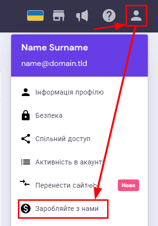 Натисніть на Ваш аватар і виберіть опцію “Заробляйте з нами”: