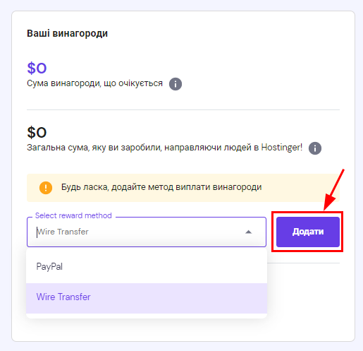 Перш ніж отримати винагороду, вам потрібно буде додати спосіб оплати. Доступні варіанти: Paypal і банківський переказ. Перейдіть до розділу «Реферальна програма», виберіть потрібний варіант зі спадного списку та натисніть “Додати”: