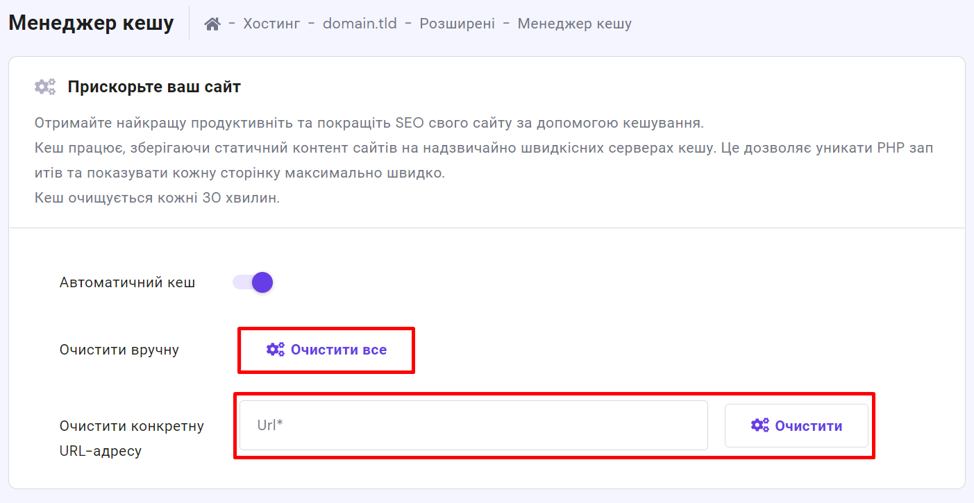 Натисніть на перемикач автоматичного кешу. Після активації менеджер кешу зберігатиме статичний контент Вашого сайту, оновлюючи його кожні 30 хвилин, щоб забезпечити доступ до останньої версії.