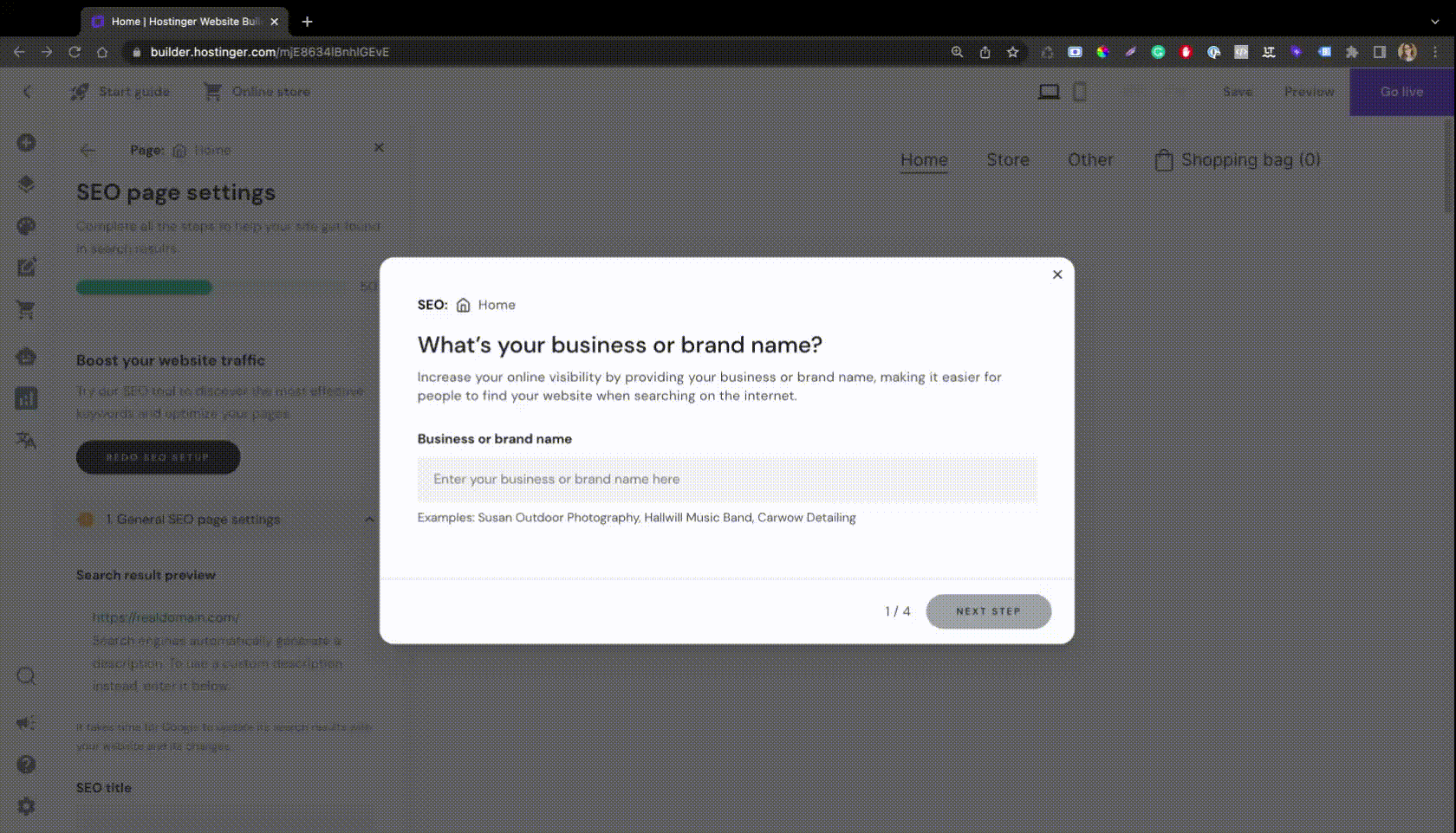 Перейдіть до загальних налаштувань SEO у конструкторі сайтів. На екрані з’явиться спливаюче вікно з проханням вказати назву Вашої компанії або торгової марки – вона використовуватиметься для загального метазаголовка Вашого сайту; Ви можете редагувати його пізніше: