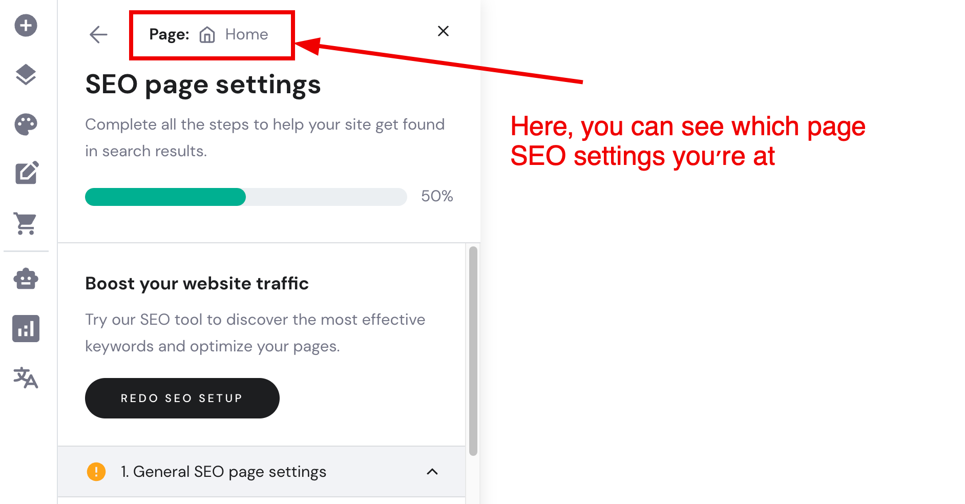 Відкрийте сторінку налаштувань SEO у конструкторі сайтів. Якщо Ви відкриваєте налаштування SEO вперше, Вам потрібно буде вказати наступне:
