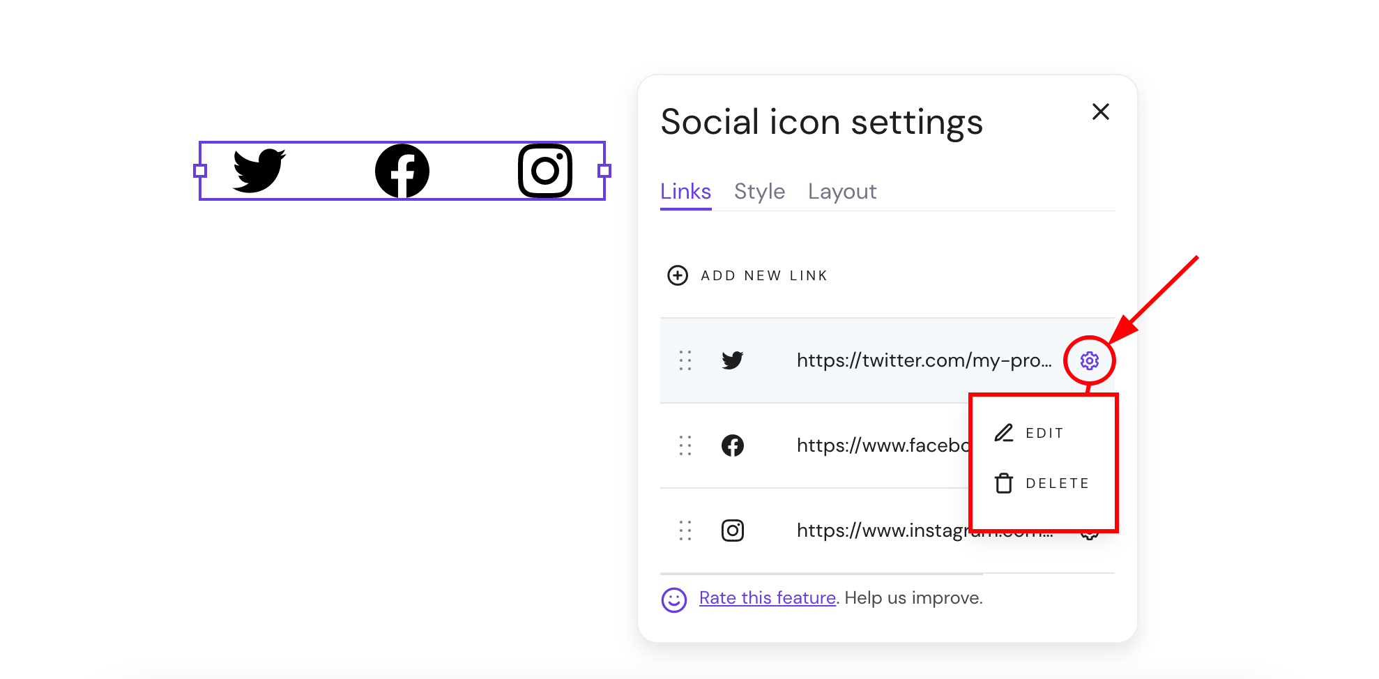 Натисніть “Редагувати соціальні піктограми” (“Edit social icons”), аби перейти до налаштування. Обов’язково додайте посилання на власні профілі та канали в соціальних мережах, щоб направити відвідувачів сайту на Ваші соцмережі. Ви можете додавати нові та видаляти непотрібні піктограми, а також змінювати їхній стиль і розташування: