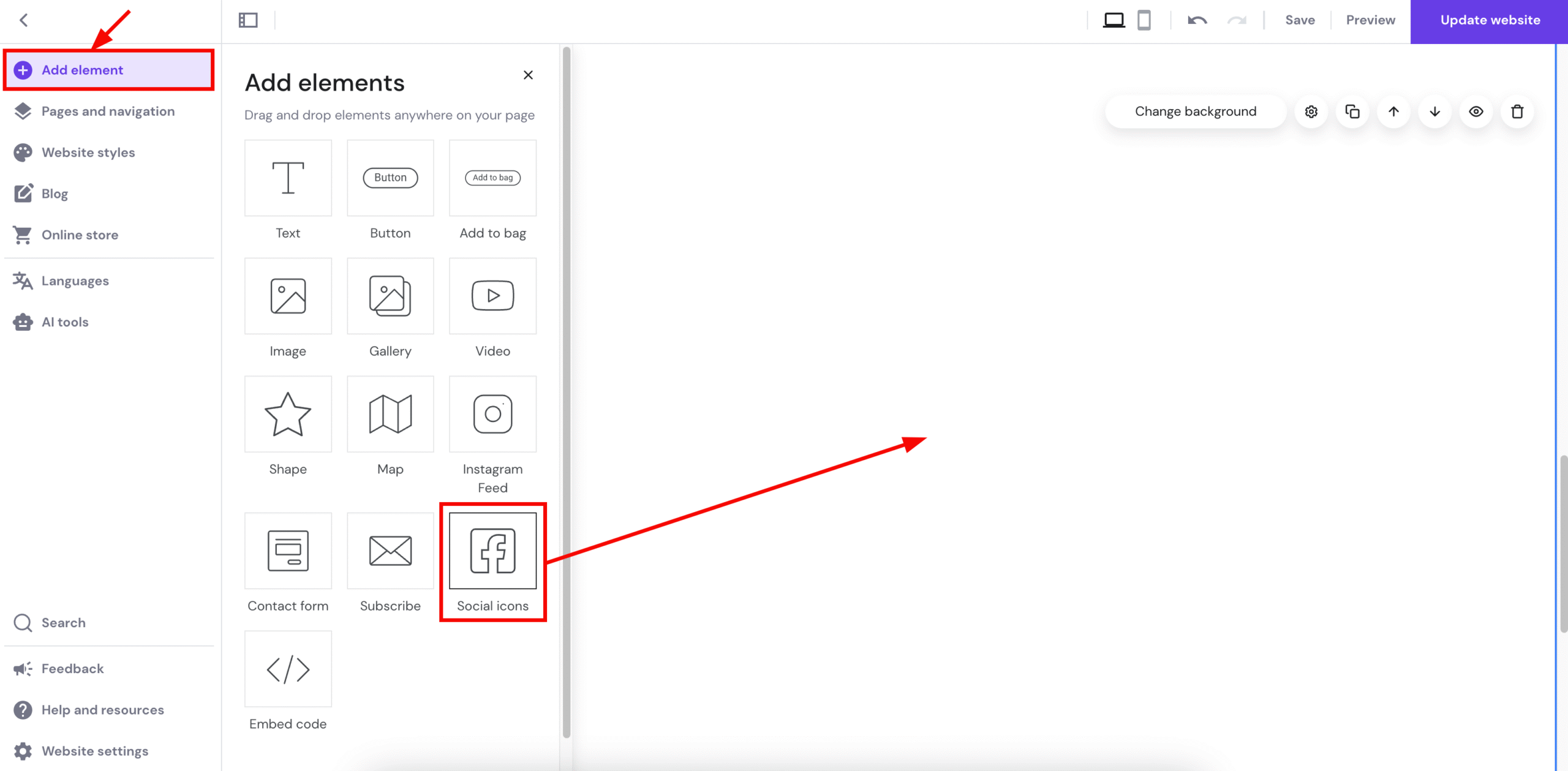 Відкрийте конструктор сайтів Hostinger, перейдіть до розділу “Додати елементи” (“Add elements”) і перетягніть елемент “Соціальні піктограми” (“Social icons”) на свій сайт: