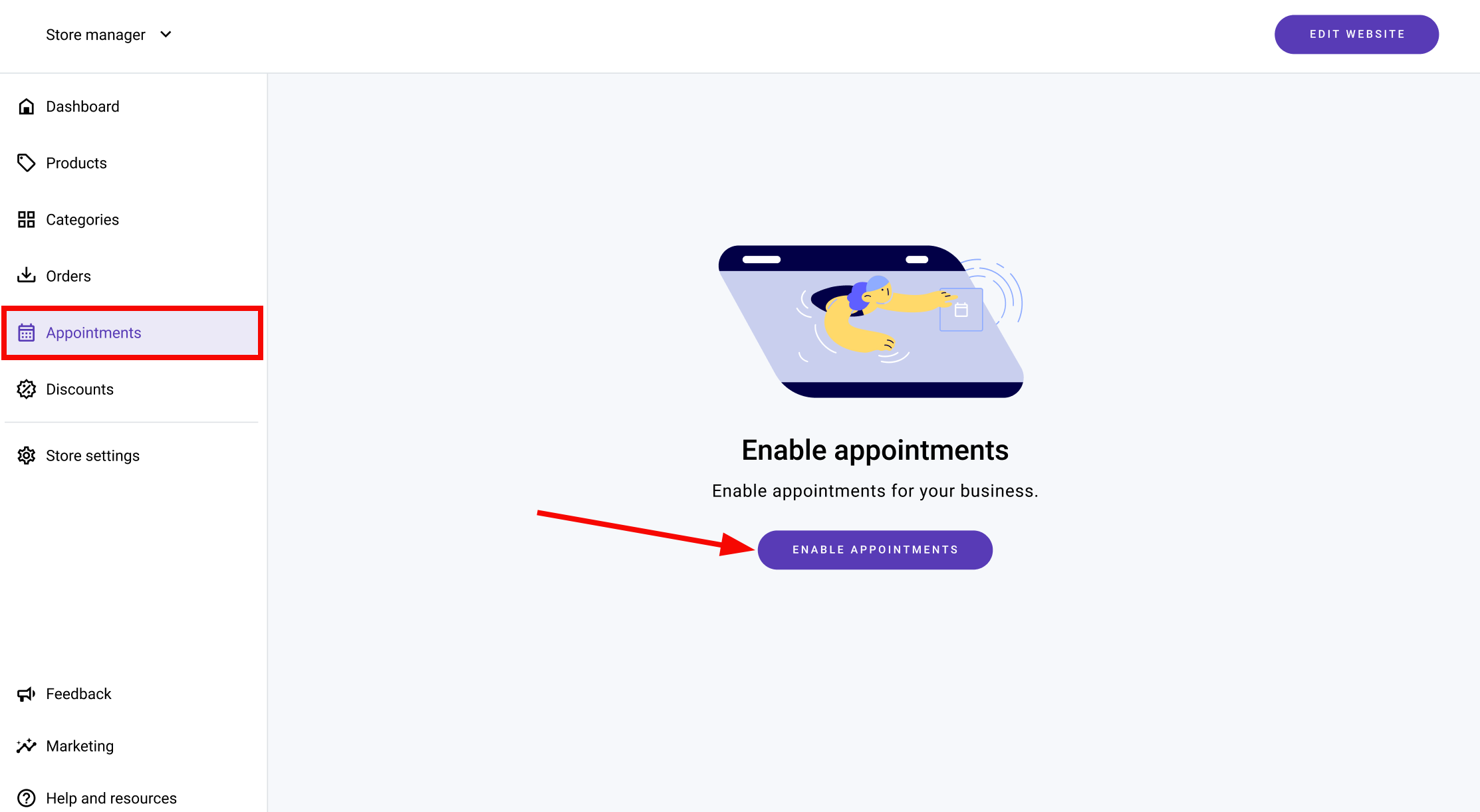 У меню управління магазином виберіть “Бронювання” (“Appointments”) та натисніть “Увімкнути бронювання” (“Enable appointments”):