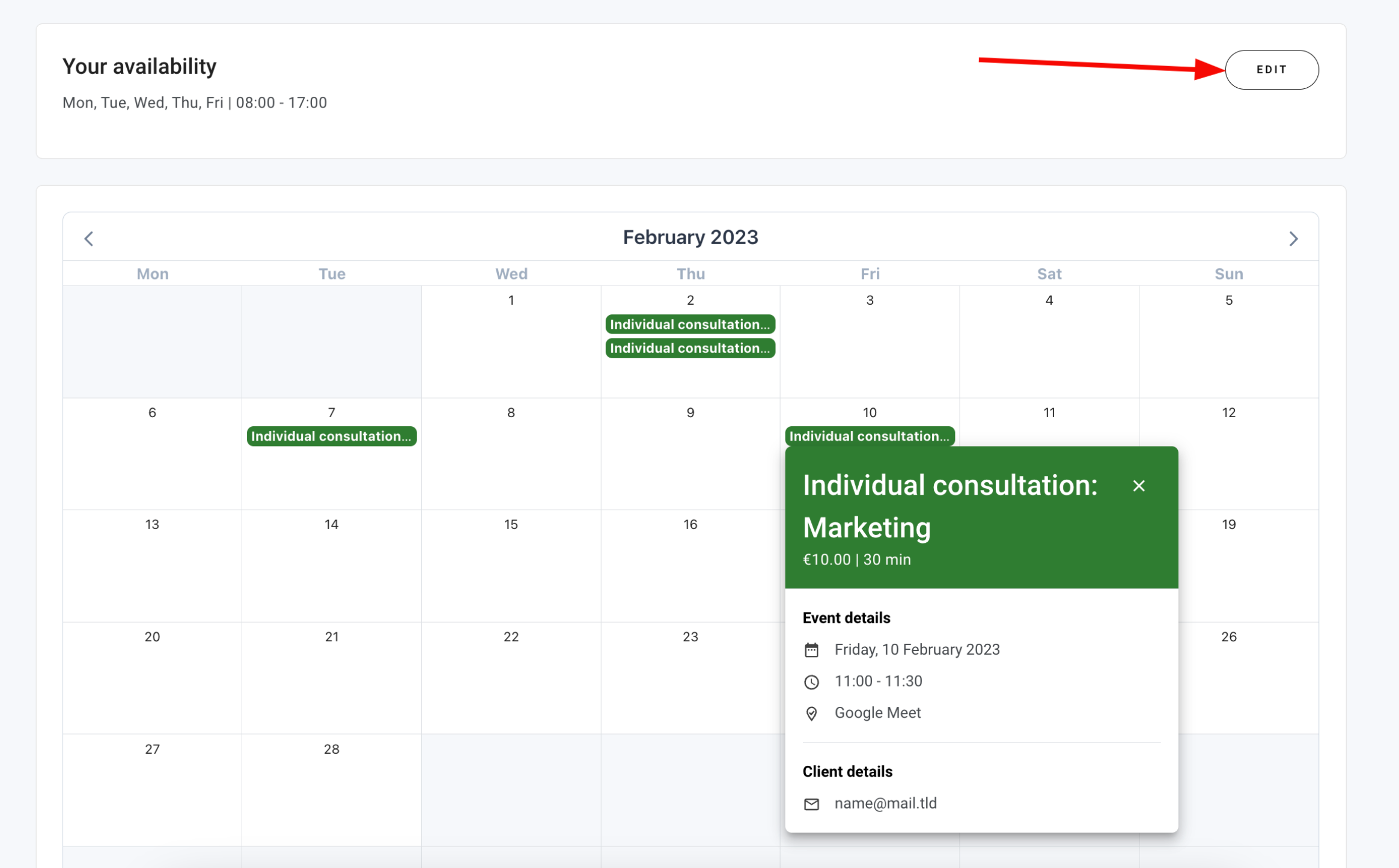 Залежно від тривалості зустрічі (мінімальна тривалість – 15 хв.) Вашим клієнтам у календарі відображаються вільні часові інтервали. Часові інтервали не накладаються один на одного та призначені для одноразового використання, тобто один часовий інтервал призначений для одного клієнта.