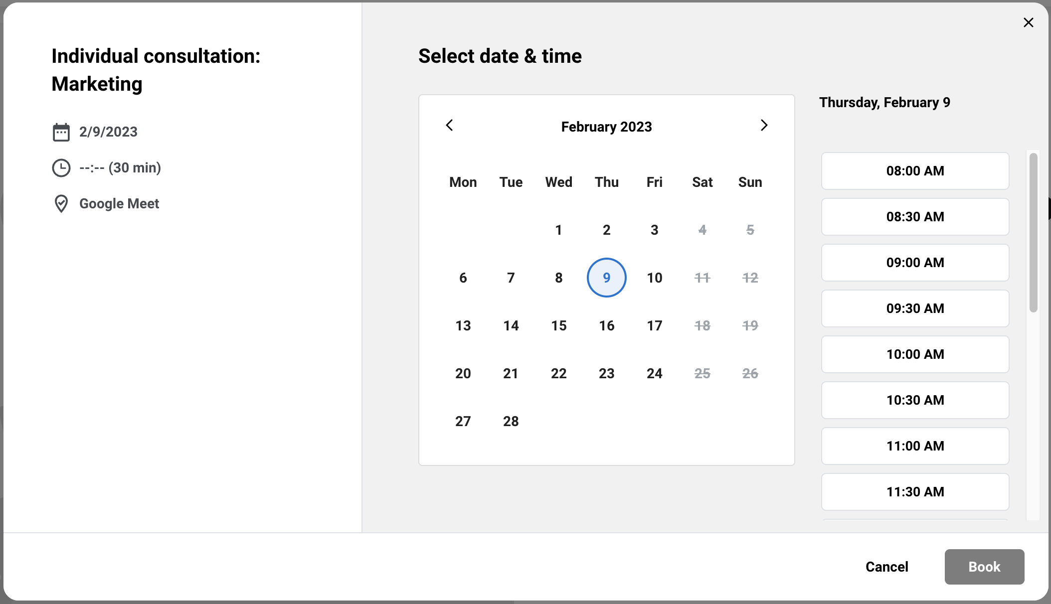 Наприклад, якщо Ви продаєте 30-хвилинні онлайн-консультації та Ваш робочий час з 9:00 до 17:00, клієнт зможе вибрати один з наступних часових інтервалів:
