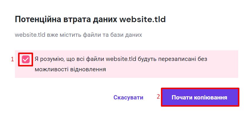 Після копіювання оригінальні файли залишаться незмінними та будуть перезаписані на кінцевий домен. Ви можете створити та завантажити резервну копію, якщо хочете зберегти ці файли.
