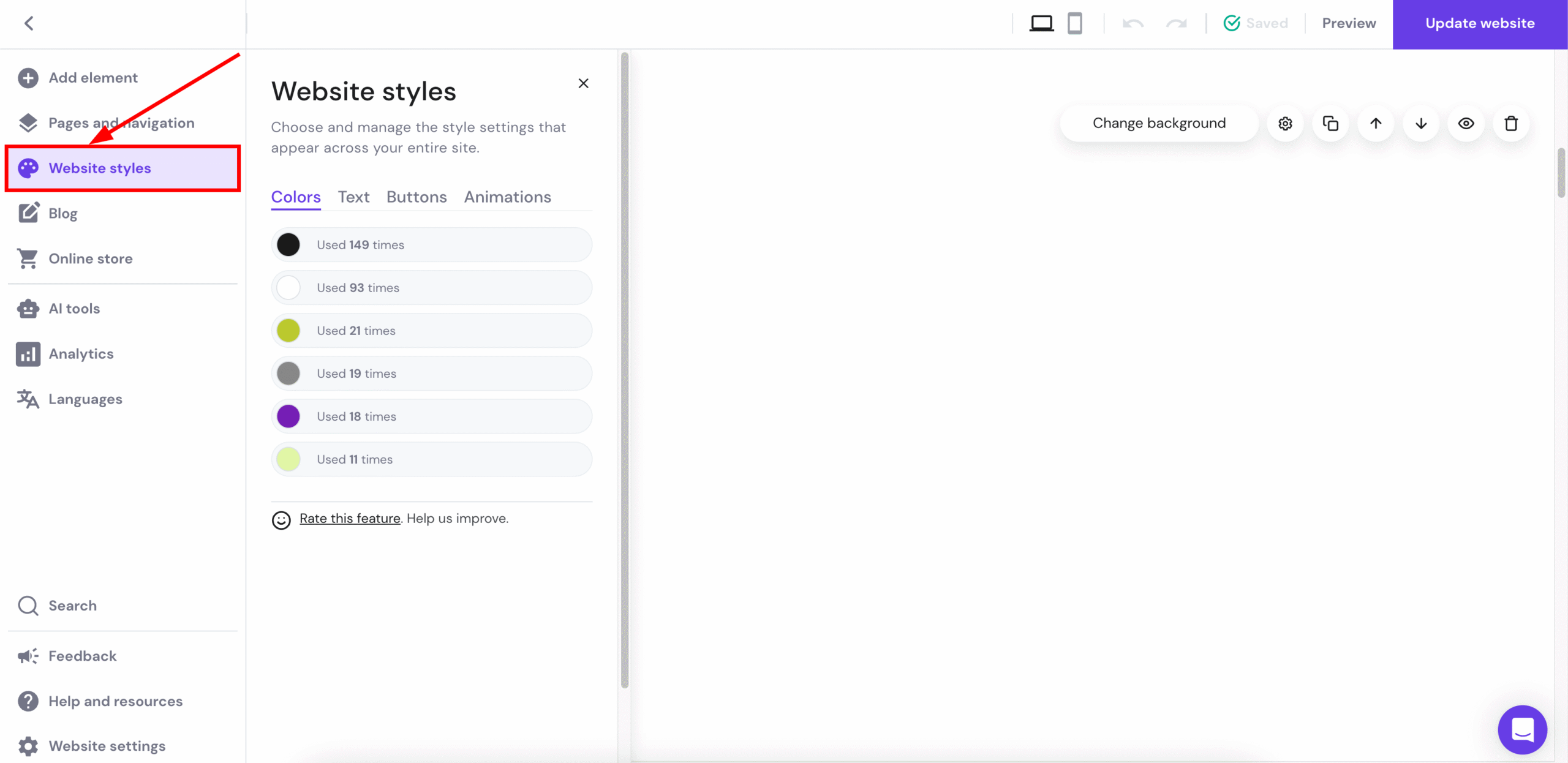 Відкрийте конструктор сайтів і перейдіть до меню “Стиль сайту” (“Website styles”):