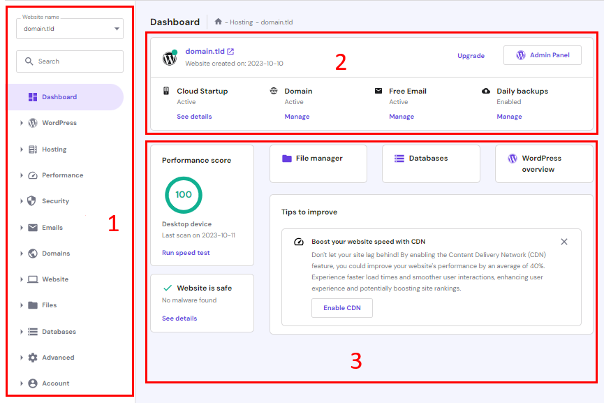 У цій панелі Ви знайдете всі опції для управління Вашим хостинг-тарифом. Вона містить перемикач домену, щоб Ви були впевнені, що керуєте потрібним доменом.