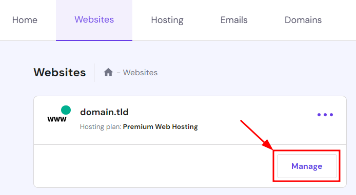 Якщо Ви хочете переглядати та керувати всіма опціями Вашого хостинг в одному місці, перейдіть до розділу “Сайти” та натисніть “Керувати” поруч з потрібним сайтом: