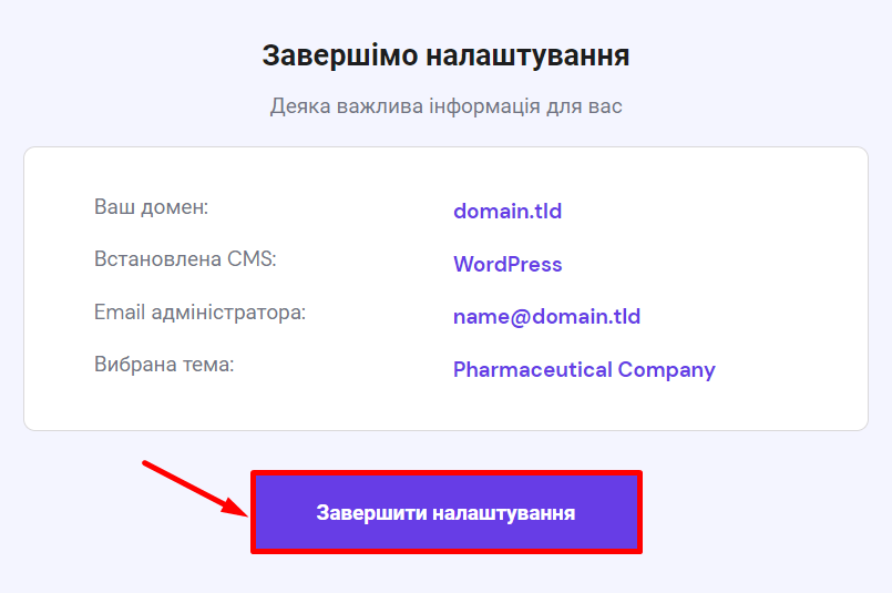 Завершуючи встановлення, Ви побачите підсумок встановлених параметрів. За потреби Ви можете внести будь-які зміни, натиснувши кнопки “Редагувати” або “Видалити”. Якщо всі параметри Вас влаштовують, натисніть Завершити налаштування: