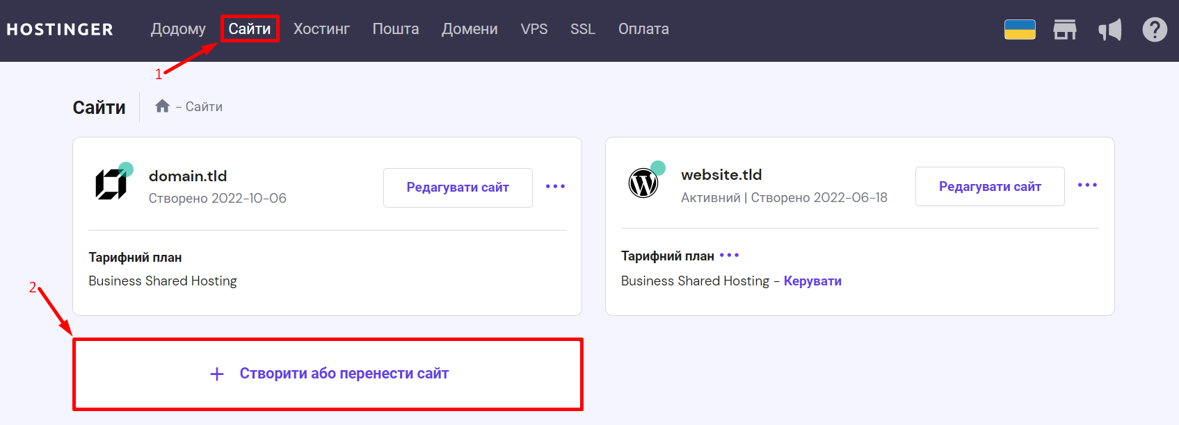 Натисніть Сайти та виберіть Створити або перенести сайт: