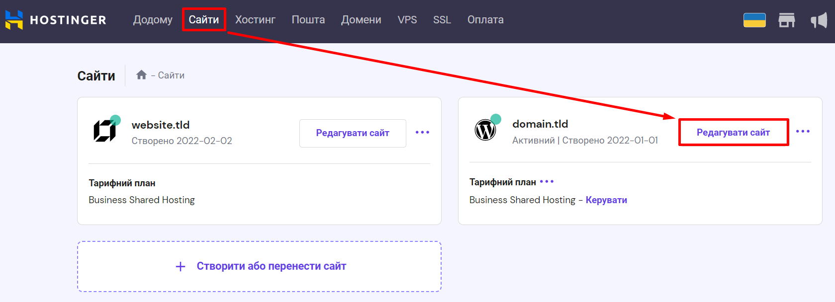 Після завершення встановлення Ви зможете керувати своїм WordPress, перейшовши в розділ Сайти та натиснувши Редагувати сайт: