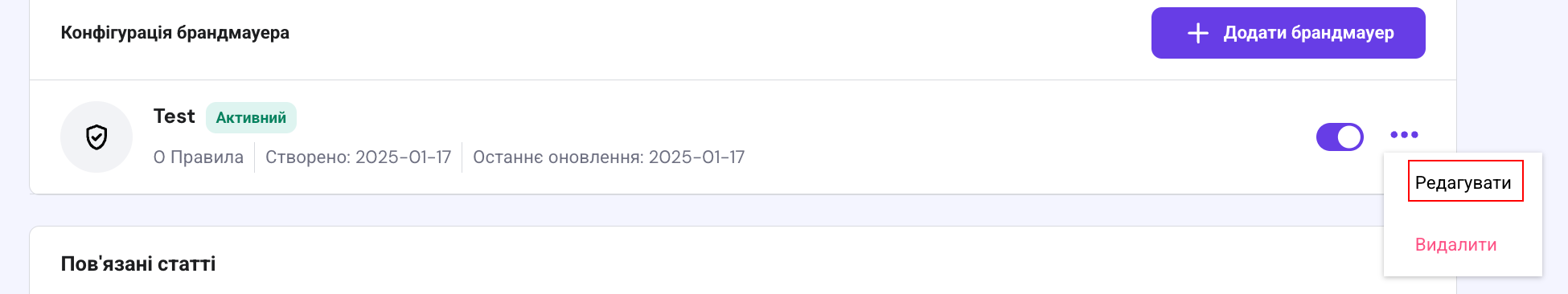 Відкрийте розділ “VPS” в панелі управління hPanel і натисніть на потрібний сервер. У лівій бічній панелі виберіть “Брандмауер”, натисніть кнопку ⋯ поруч зі списком бажаної групи брандмауера і виберіть “Редагувати”: