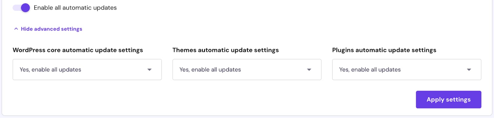 Коли Ви увімкнете автоматичне оновлення WordPress в панелі управління hPanel, автооновлення WordPress, яке активоване за замовчуванням, буде вимкнено 💡