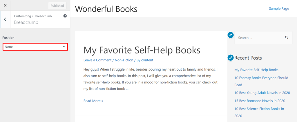 Choose where you want your breadcrumbs to appear by clicking on one of the options from the Position drop-down menu.