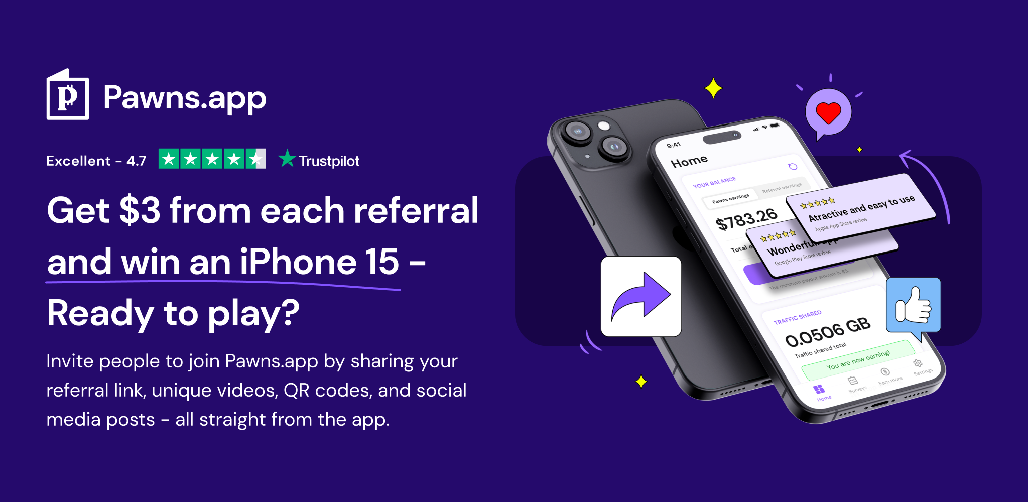 By promoting and referring people to install and use the Pawns.app on their devices, you can earn a 10% commission on their earnings. The more people sign up through your affiliate link, the more earning potential you have.