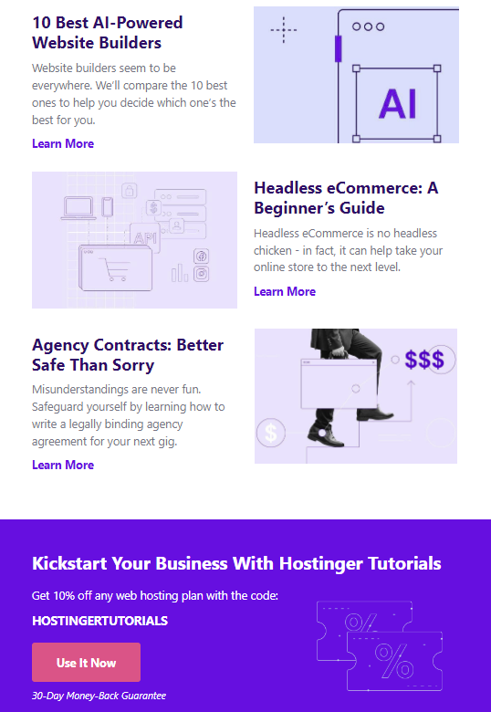 For instance, Hostinger’s newsletters offer knowledge nuggets and educational blog posts to give readers a better understanding of web hosting and website development. Popular blog post types include tutorials, listicles, and resource lists.