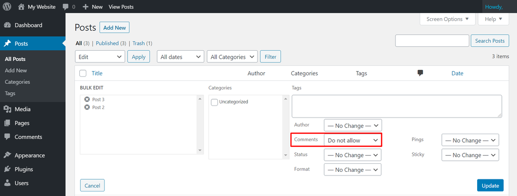This setting is a bit quicker than the first option (bulk edit). Unfortunately, you can’t apply this technique to pages. If you have comments on your pages and want to disable them in bulk, follow the first option.