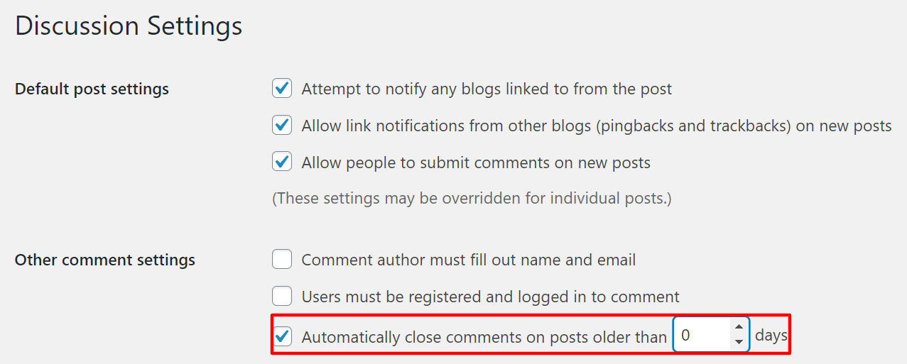 2. Under Discussion Settings > Other comment settings, find the Automatically close comments on posts older than … days setting. Fill the field with 0 to turn off comments for all posts.