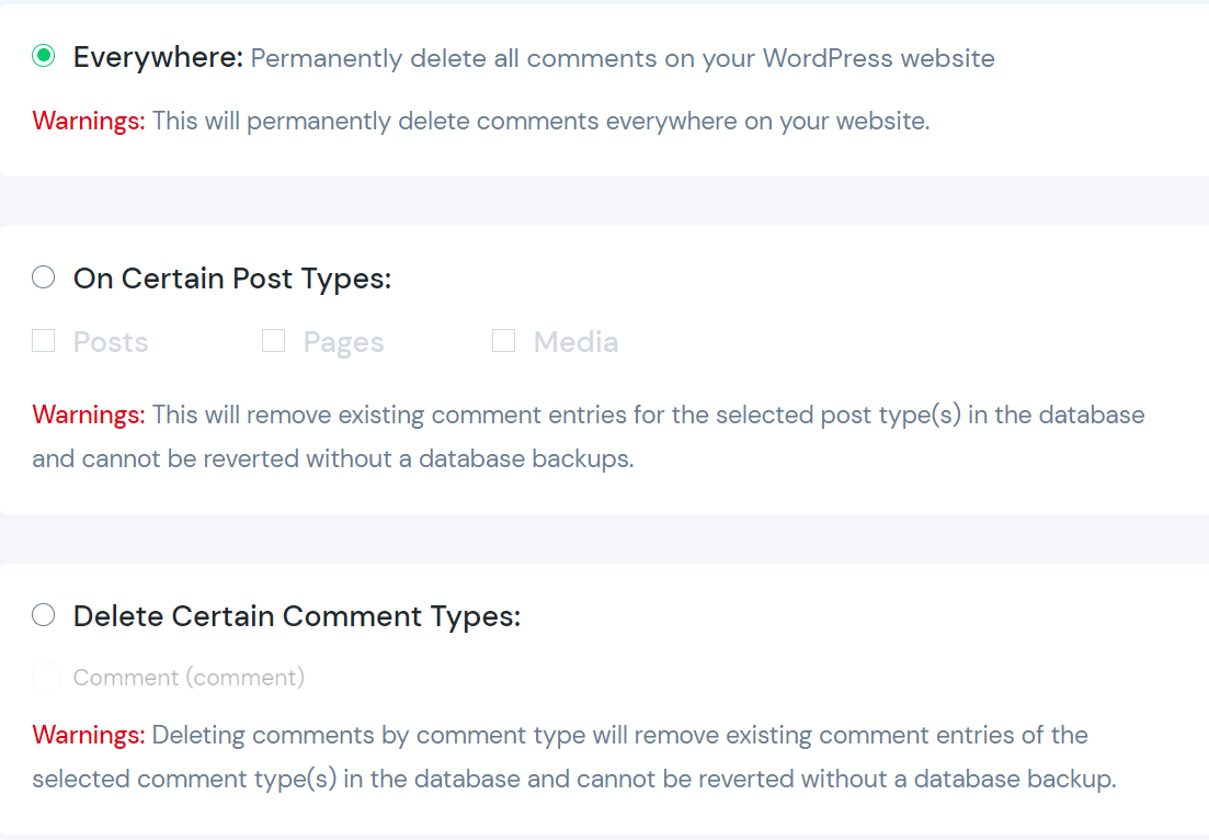 Or you can choose to Delete Certain Comment Types if you want a specific WordPress comment removed, for example, those under WooCommerce product reviews.