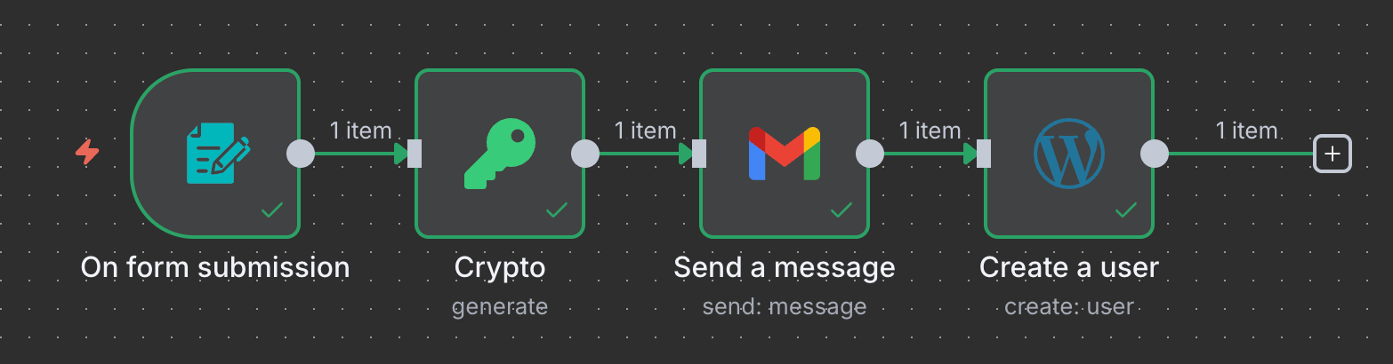 If everything works correctly, your workflow should turn green. The email address you entered in the form will receive the welcome message, and a new user account will appear in your WordPress instance.