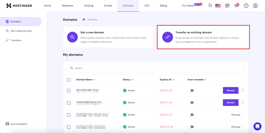 Here’s a step-by-step guide to purchasing a domain transfer at Hostinger: