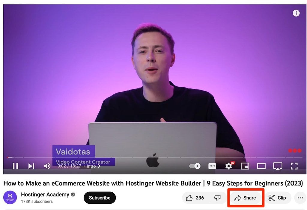 1. Locate the Share button beneath the YouTube video.