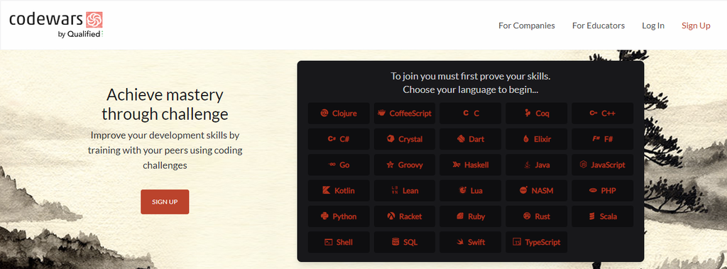 It provides coding exercises for eight programming languages: C#, C++, Java, JavaScript, PHP, Python, Ruby, and Swift. After solving 15 free challenges, users can purchase a Pro account for unlimited access. The three pro options are Monthly at $39/month, Yearly at $10/month, and Lifetime for $299.
