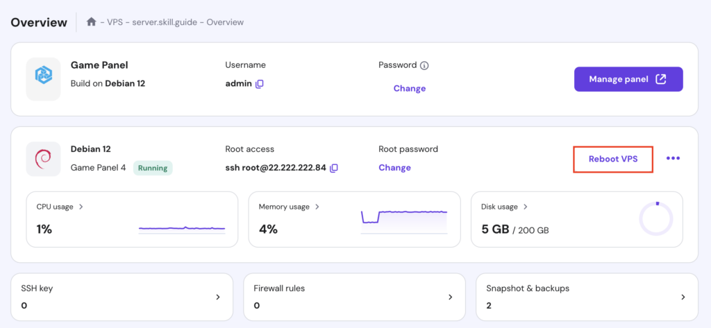 6. Click Reboot VPS in your game server’s Overview page.