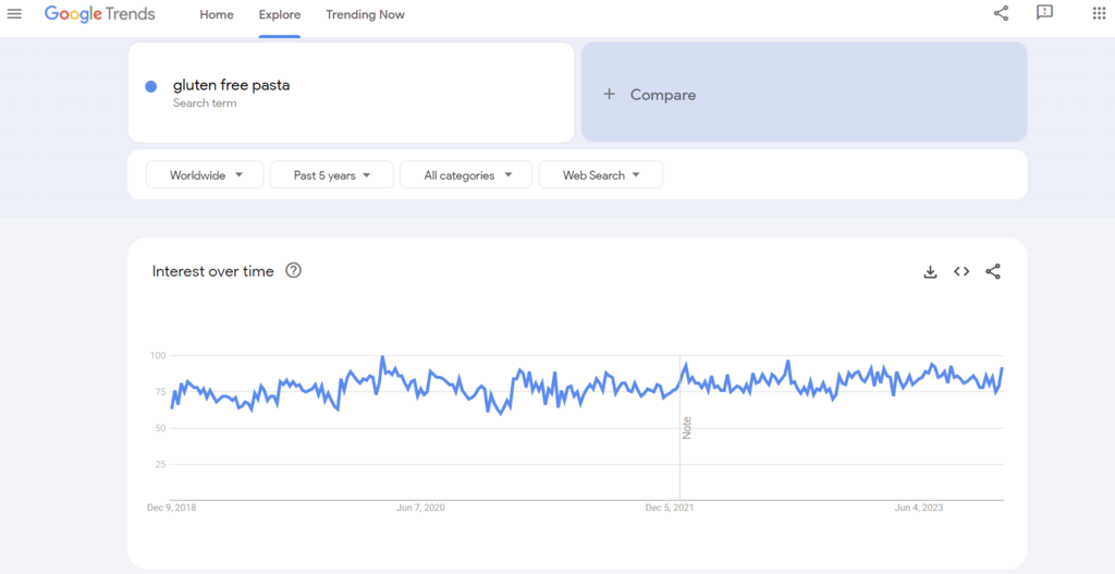 Google Trends data shows that the search volume for “gluten free pasta” has always been high. This is probably because gluten-free pasta has become a staple food for people with gluten intolerance. As a result, the product is always in demand.