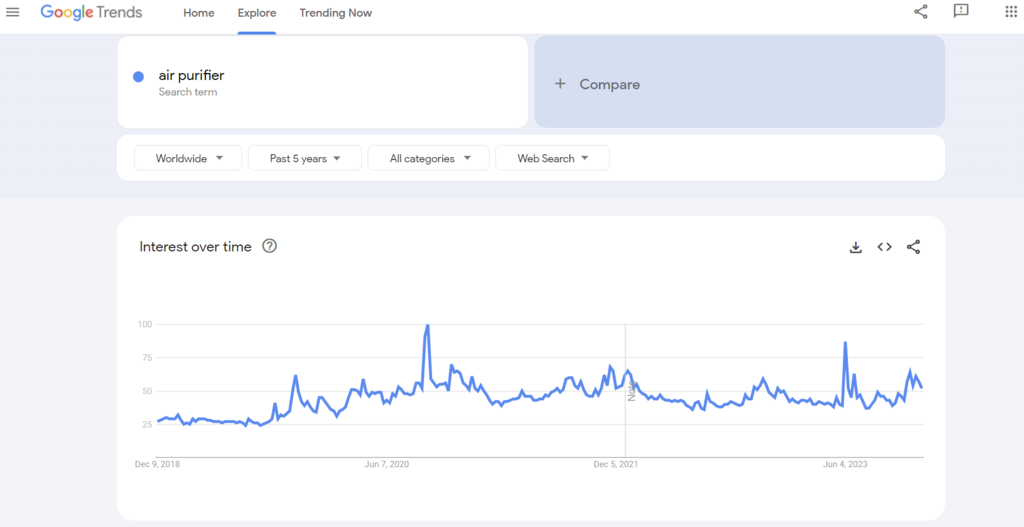 According to Google Trends, the search volume for “air purifier” has increased in recent years. The keyphrase reached peak popularity in September 2020 and continues to garner high interest until the end of this year.