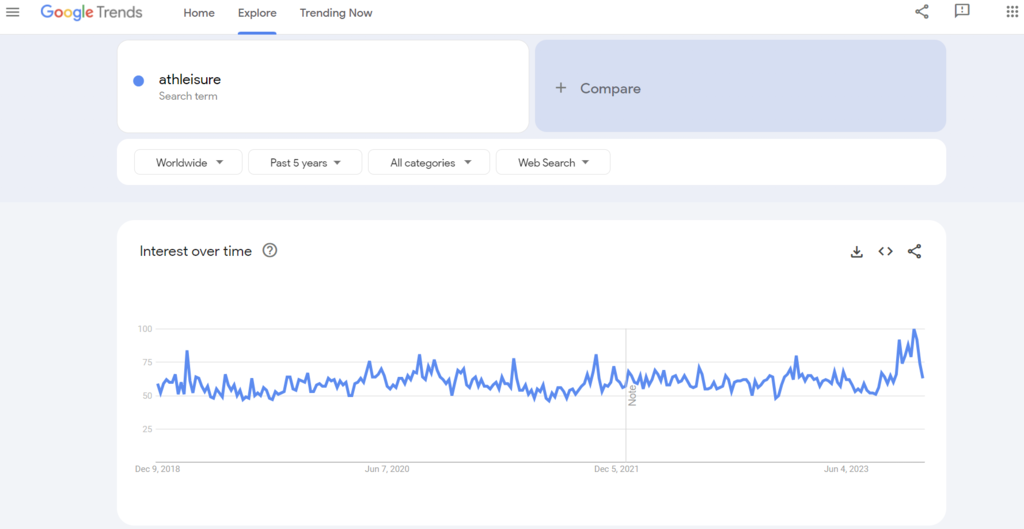 The search volume for “athleisure” on Google Trends has stayed relatively high and stable over the years.