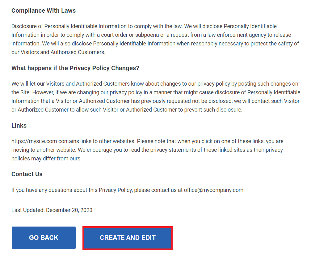 The plugin will automatically generate a custom privacy policy draft. Scroll down and select CREATE AND EDIT, leading to the WordPress editor.